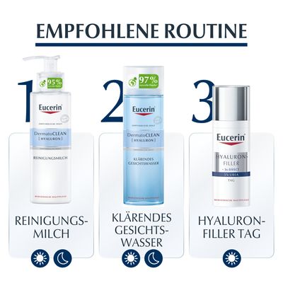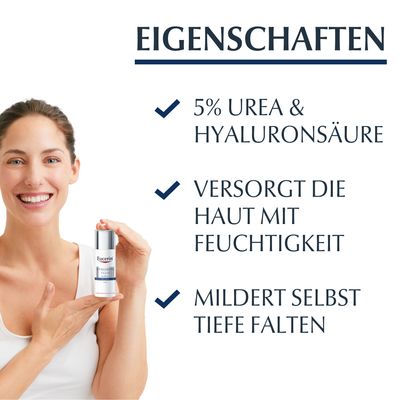 Eucerin Hyaluron-Filler Urea spendet intensiv Feuchtigkeit und mildert tiefe Falten. Lang- und kurzkettige (im Vergleich 40x kleinere) Hyaluronsäure bindet Feuchtigkeit in den oberen und tieferen Hautschichten, wo tiefere Falten entstehen. Das PLUS: Urea sorgt für eine glattere Hautoberfläche. Es pflegt spürbar und beruhigt. Die Produkte sind parfümfrei und auch bei Neurodermitis und Psoriasis geeignet.