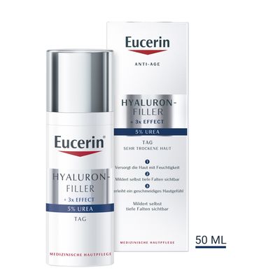 Mit der Zeit lässt die Produktion der hauteigenen Hyaluronsäure nach, wodurch sich Falten bilden und die Haut älter aussieht. Bei zudem trockener Haut können schnell Juckreiz und Spannungsgefühle entstehen. Die Eucerin Hyaluron-Filler 5% Urea Tagespflege spendet mit ihrer einzigartigen Formel intensive Feuchtigkeit und mildert selbst tiefe Falten sichtbar.